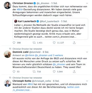 Fun-Fact am Rande: In Folge sollte sich der Virologe dann auch noch gegenüber dem Bild-Chefredakteur „verantworten“, der sich beschwerte, dass in einem ersten Post die Kontaktdaten des anfragenden Autors mitveröffentlicht wurden … Drosten korrigierte dies, der Bildartikel jedoch blieb so falsch wie er war.