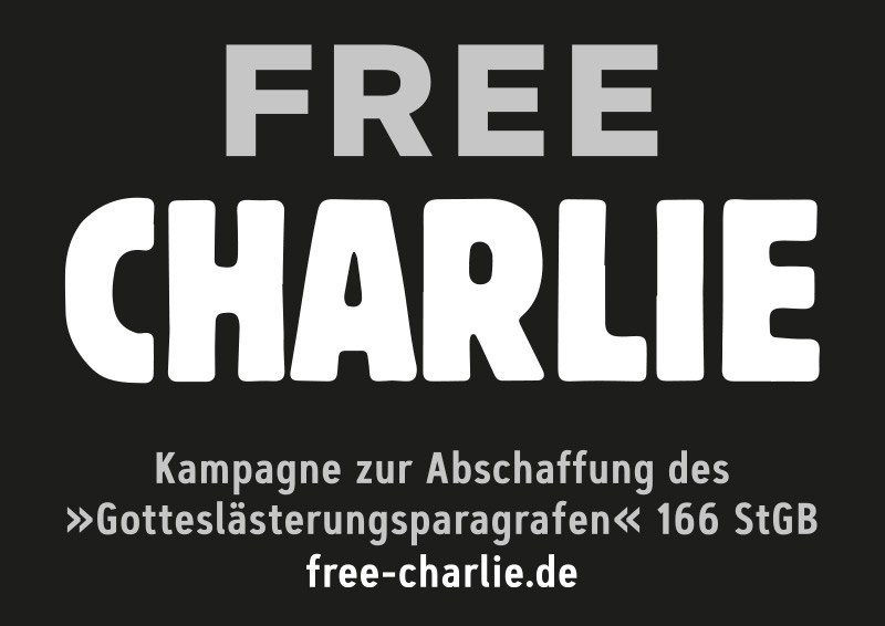 Dass es sich hier um eine groteske Umkehrung des »Täter-Opfer-Prinzips«: handelt, ist offensichtlich, denn selbstverständlich wird der öffentliche Friede nicht durch kritische Karikaturen oder Wortmeldungen gestört, sondern durch religiöse Fanatiker, die nicht hinnehmen wollen, dass ihr Gott kritisiert, lächerlich oder verhöhnt werden kann. Doch wir leben in einem Verfassungs- und keinen Gottes-Staat. Um diesen Punkt zu untermauern, wurde nun die »Free Charlie!«-Kampagne gestartet. Sie wirbt um Unterstützung bei ihrem Vorhaben, den Gotteslästerungs-Paragrafen zu kippen.