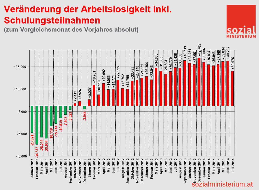 Die Arbeitslosigkeit in Österreich ist auch im Juli mit 9,7 Prozent wieder deutlich gegenüber dem Vergleichsmonat im Vorjahr angestiegen, 351.313 Personen sind ohne Job. Gemäß nationaler Definition liegt die Arbeitslosenquote somit bei 7,3 Prozent, das sind 0,7 Prozentpunkte mehr als im Juli des Vorjahres.