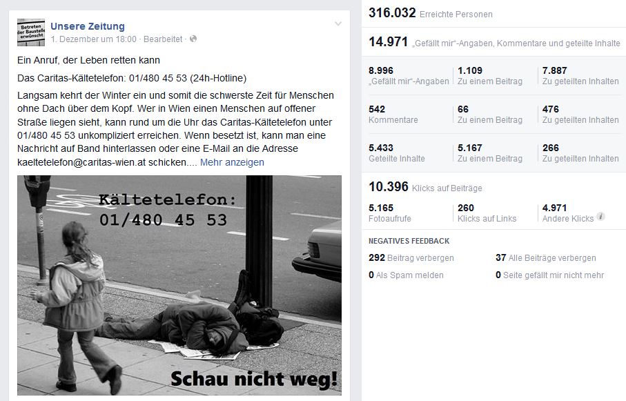 Somit haben wir in der Zwischenzeit unzählige Beiträge veröffentlicht, Artikel verlinkt, Fotos & Videos hochgeladen und Tweets verfasst. Die mit Abstand größte Reichweite erzielte dabei unser Hinweis auf das Kältetelefon der Wiener Caritas vom 1. Dezember: Der Aufruf, insbesondere im Winter Obdachlosen zu helfen und nicht wegzuschauen, erreichte auf Facebook bis heute 316.032 Personen, 14.971 „Gefällt mir“-Angaben und wurde 5.433 Mal geteilt.
