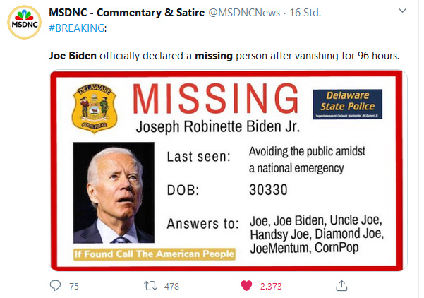 Der seit nahezu einer Woche verschollene Joe Biden ist nun doch wieder aufgetaucht. Die wahrscheinlichen Hauptgründe, die Beobachter für sein Verschwinden angeben, sind alle gesundheitlicher Natur (Coronavirus, Schlaganfall, Demenz). Alle wissen Bescheid, wie klapprig und unbrauchbar Biden ist, und viele tun so, als sei nichts. Im Folgenden die letzten beiden Videos von und mit Biden, die auch für sich sprechen: