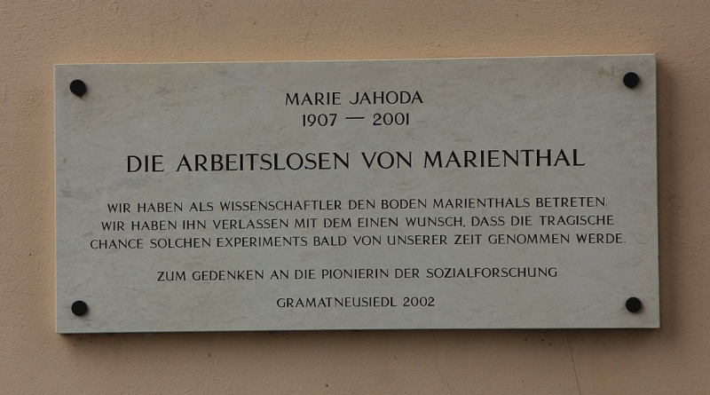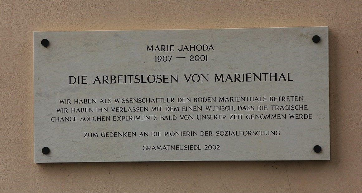 Titelbild: Gedenktafel zur Erinnerung an Marie Jahoda in Marienthal in Gramatneusiedl (Foto: Karl Gruber / Wikimedia Commons / CC BY-SA 4.0