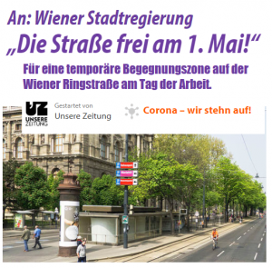 Die von Unsere Zeitung initiierte Petition „Die Straße frei am 1. Mai! – für eine temporäre Begegnungszone auf der Wiener Ringstraße am Tag der Arbeit.“ wurde unterdessen von rund 600 Personen unterzeichnet. Eine Reaktion auf unser Schreiben an die Wiener Stadtregierung steht bis heute aus. Einem „feierlichen Spaziergang“ auf der Ringstraße wird allerdings aufgrund der zahlreichen angemeldeten Kundgebungen und Demonstrationen ohnedies kein Auto im Wege stehen.