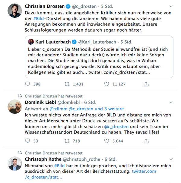 Dominik Liebl: „Ich wusste nichts von der Anfrage von Bild und distanziere mich von dieser Art, Menschen unter Druck zu setzen, auf´s schärfste. Wir können uns glücklich schätzen, Dr. Drosten und sein Team im Wissenschaftsstandort Deutschland zu haben. They saved lifes!“