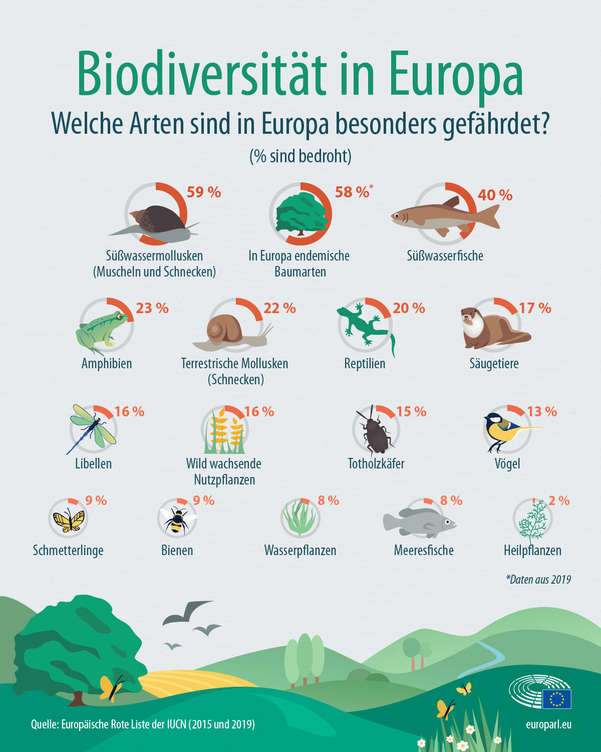 Hier sind Schnecken, Muscheln und Fische am stärksten gefährdet und über die Hälfte aller endemischen Baumarten bedroht. Eine von 10 europäischen Bienen- und Schmetterlingsarten ist vom Aussterben bedroht und rund ein Fünftel der Amphibien und Reptilien sind gefährdet. Zu den bedrohtesten Säugetierarten im europäischen Raum zählen Polarfuchs, Nerz, Mönchsrobbe, Eisbär und Glattwal – und in Österreich steht u.a. das Ziesel ganz oben auf der Gefährdeten-Liste.