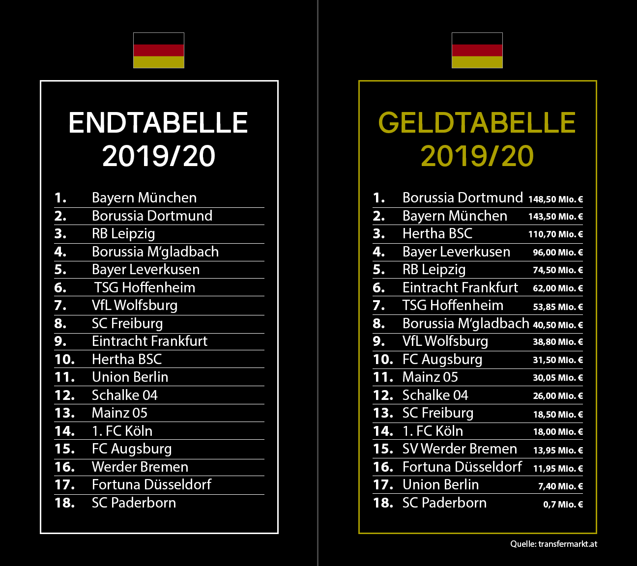 Was den FC Chelsea betrifft, der Vierter wurde und in Geldtabelle auf den ersten Blick überraschend nur auf Rang 16 liegt: Den Londonern wurde von der FIFA eine Transfersperre auferlegt, weil sie bei Transfers von Jugendspieler gegen Regeln verstoßen hatten. Diese Sperre lief im vergangene Jänner aus, womit Chelsea 2019/20 nur in einer, nämlich der Wintertransferperiode, aktiv werden konnte.