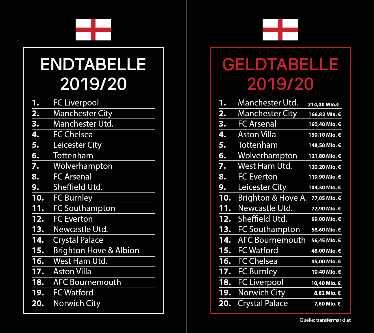 Den größten finanziellen Bauchfleck legte allerdings Aston Villa hin: Mit großen Ambitionen und Transferausgaben von fast 160 Millionen Euro (Rang 4 in der Geldtabelle) hätten sich Fans und Verantwortliche wohl mehr erhofft als den enttäuschenden 17. Platz, der es am Ende wurde. Nur auf dem achten Platz stand am Ende der Spielzeit 19/20 der FC Arsenal – obwohl über 160 Millionen Euro für neue Spieler ausgegeben wurde (Geldtabelle: Rang 3).