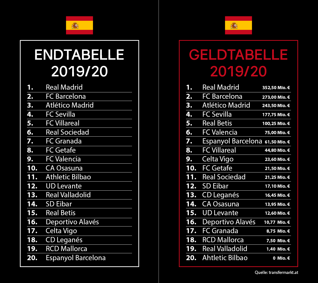 Das ist Höchstwert in der Primera División, womit die Königlichen in der spanischen Geldtabelle für die Saison 19/20 auf Platz 1 liegen. Diese Tabelle könnten also genauso gut „Tabelle der Ausgaben in der Saison 19/20“ heißen, wir haben uns in aller Kürze für “Geldtabelle” entschieden.
