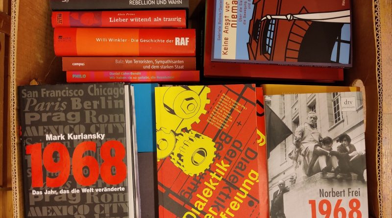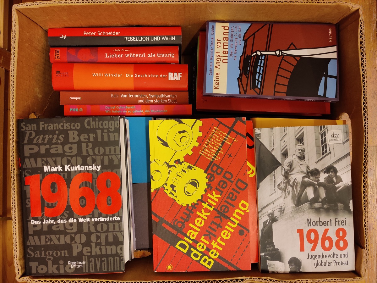 Gesprächig und kontaktfreudig blieb ein Graphik-Student aus Leipzig mit seiner Begleitung eine längere Weile im Laden, sie waren zu Besuch in Wien. Begeistert betrachtete er die Max Beckmann Werkverzeichnisse, die gesammelt im Regal standen, und bedauerte, sie sich nicht leisten zu können. Anstatt dessen nahm er sich ein kleines Büchlein mit: „Kunst und Revolte. Das politische Plakat und der Aufstand der französischen Studenten“, von Louis F. Peters, 1968 bei DuMont Aktuell erschienen. Es beinhaltete ein originales DIN A0-Plakat. Der rote Holzschnitt zeigt einen gänzlich bandagierten Kopf, mit hypnotischen Augen, dessen Mund mit Stecknadeln verschlossen ist. Darüber ist auf Französisch zu lesen: „une jeunesse que l’avenir inquiète trop souvent“ („Eine Jugend, die sich über die Zukunft zu oft Sorgen machen musste“).