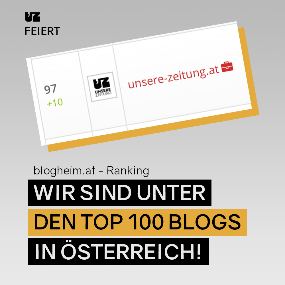 Die Freude in der UZ-Redaktion war groß, als wir das Ergebnis des neuen Topblog-Rankings von blogheim.at (1.11.2020) erfuhren. Die wöchentlichen Schwerpunkt-Kolumnen, regelmäßige Beiträge unserer Stammautor_innen, mehr Gastartikel und nicht zuletzt ein engagierter UZ-Koordinator, der dies alles gewissenhaft auf die Homepage stellt und über unsere Social-Media-Kanäle verteilt, all dies führt dazu, dass laufend neue Leser_innen für Unsere Zeitung gewonnen werden. Dementsprechend konnten wir uns im Topblog-Ranking um 10 Plätze im Vergleich zum Vormonat steigern und sind erstmals unter den besten 100 Blogs Österreichs vertreten.