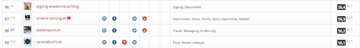 Ein Blick auf die Liste der 100 Topblogs zeigt, dass Unsere Zeitung dabei das einzige Portal ist, das explizit auf überregionale Nachrichten und ein buntes Programm aus Politik, Kultur, Sport, Geschichte u.s.w. setzt. Mehr als die Hälfte (51) der reichweitenstärksten Blogs Österreichs befassen sich mit den Themen Reisen & Lifestyle, bei rund einem Drittel (32) dreht sich (fast) alles um Ernährungsfragen (Food-Blogs), Internet & Computer(spiele) sind die Schwerpunkte von 9 der 100 Topblogs, darunter auch das bekannte Portal gegen Internetmissbrauch mimikama.at (Platz 2). Regionale Nachrichten (3), das Bloggen & Schreiben selbst (2) sowie Autos und Sport (je 1) sind die weiteren Themen.