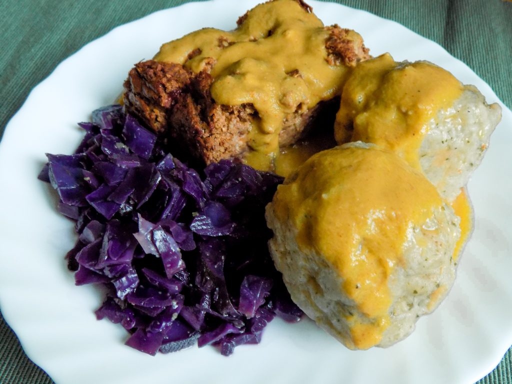 Der Vegane Linsenbraten mit Semmelknödel von Bianca Zapatka ist mit Sicherheit eines der leckersten und deftigsten Gerichte, die in der veganen Küche zu finden sind. Satt wird man damit auf jeden Fall, und mit Rotkraut kommt man kulinarisch in der Weihnachtszeit an.