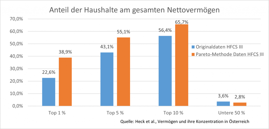 (2) Erstens werden die reichsten Haushalte aufgrund ihrer geringen Anzahl in Zufallsstichproben tendenziell nicht ausreichend erfasst (nonobservation). Vermögendere Haushalte neigen weiters eher dazu, die Teilnahme an einer Vermögenserhebung zu verweigern (nonresponse). Und drittens können die befragten Kompetenzträger*innen der Haushalte ihr Vermögen bewusst oder unbewusst unterschätzen (underreporting). Letzteres tritt verstärkt bei (veranlagtem) Finanzvermögen auf, das bei den reichen Haushalten üblicherweise einen größeren Anteil des Gesamtvermögens ausmacht, wodurch die Qualität der Informationen über (besonders) vermögende Haushalte verschlechtert wird. Ansatzpunkte um diese Probleme zu beheben wären ein Oversampling besonders vermögender Haushalte, etwa durch Zugang zu Einkommenssteuerdaten, oder eine gesetzmäßig verpflichtende Teilnahme an der Erhebung. In Österreich ist jedoch keiner dieser Punkte erfüllt. In Summe führen alle drei Schwachstellen dazu, dass reiche Haushalte in der Stichprobe nicht ausreichend erfasst sind und die Vermögensungleichheit damit unterschätzt wird. Deshalb versuchen sich Heck, Kapeller und Wildauer durch Korrektur von Verzerrungen aufgrund von nonobservation und nonresponse an ein genaueres Bild der realen Vermögensungleichheit anzunähern.