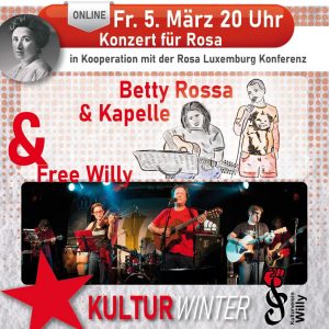 Im Anschluss daran findet ab 20 Uhr ein „Konzert für Rosa“ statt. In Kooperation mit dem Kulturverein Willy aus Linz steigt eine riesen Geburtstagsparty für die am 5. März 1871 geborene Revolutionärin Rosa Luxemburg. Ein bunter Abend voll mit kämpferischen Arbeiter*innen- und Prostestliedern interpretiert von Betty Rossa & Kapelle und Free Willy, der Hausband des traditionellen Festival des politischen Liedes.