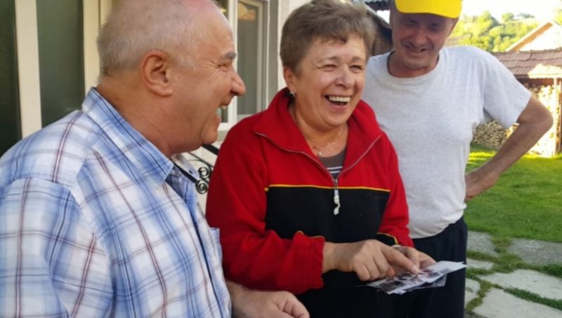 Nach indessen acht Stunden intensiver Suche und Fahrtzeit über traumhafte Berglandschaften und Ortschaften inmitten der Karpaten kamen wir endlich im richtigen Ort an. Hier machten wir uns alle gemeinsam an die „Arbeit“ und befragten etliche Bewohner anhand der fast 50 Jahre alten Fotos, wo dieses Haus sich genau befindet oder ob sich jemand an die Menschen aus dieser Zeit erinnern kann. Viele Befragungen liefen ins Leere. Am späten Nachmittag, es wurde schon langsam dunkel, machten wir schon fast verzweifelt an einem kleinem Lebensmittelladen halt. Gegenüber standen ein paar Herren mit einer Flasche Feierabendbier und eine nette Dame. Tatsächlich war der letzte verzweifelte Versuch die Familie zu finden EIN VOLLTREFFER.