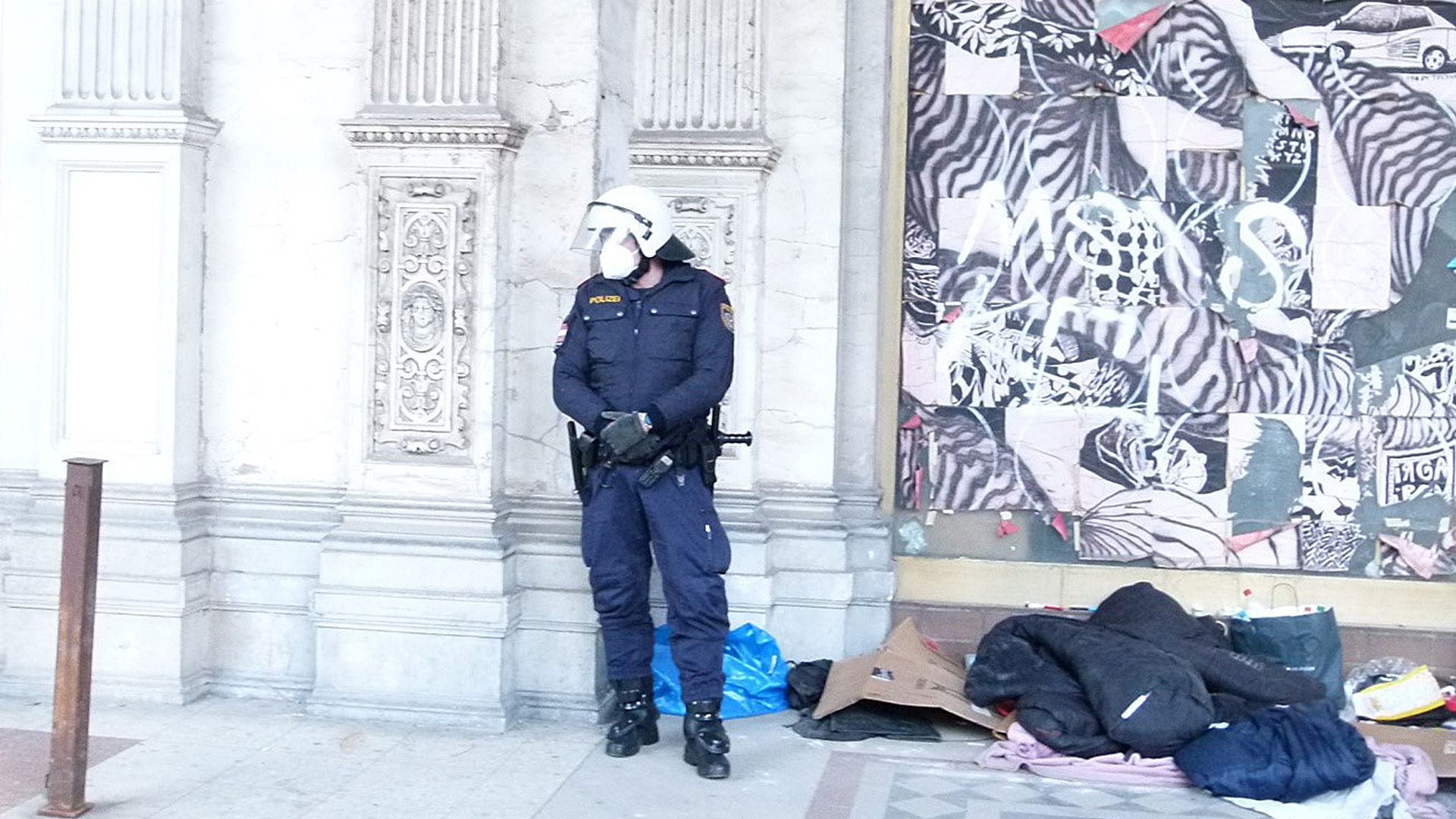 „Nachdem Studierende ein Transparent auf dem Gerüst der Votivkirche hissten, eskalierte die Polizei die Situation. Es kam zu massivem Gewalteinsatz, Verfolgungsjagden, Verhaftungen und Pfeffersprayeinsatz, auch gegen Journalist:innen.“ #w0105 Presse Service Wien