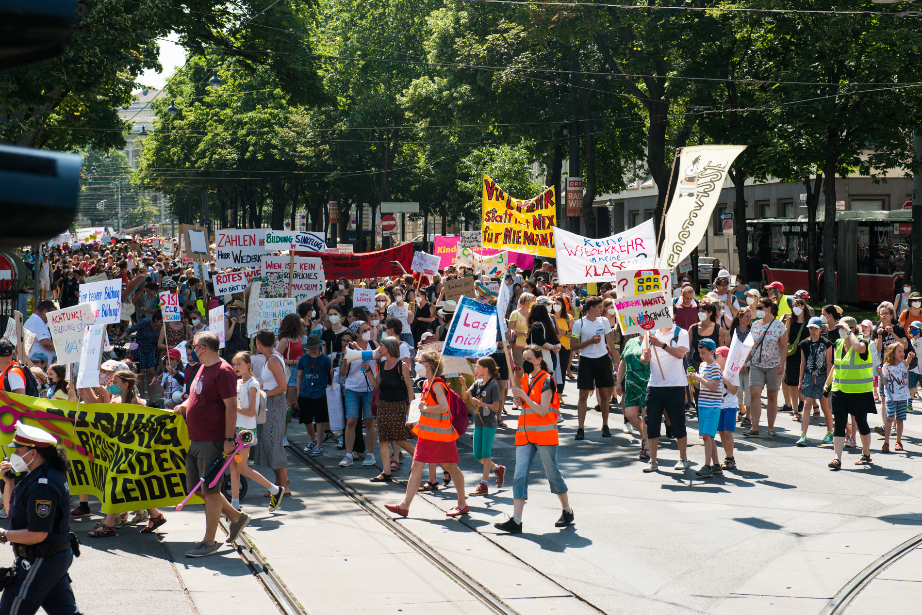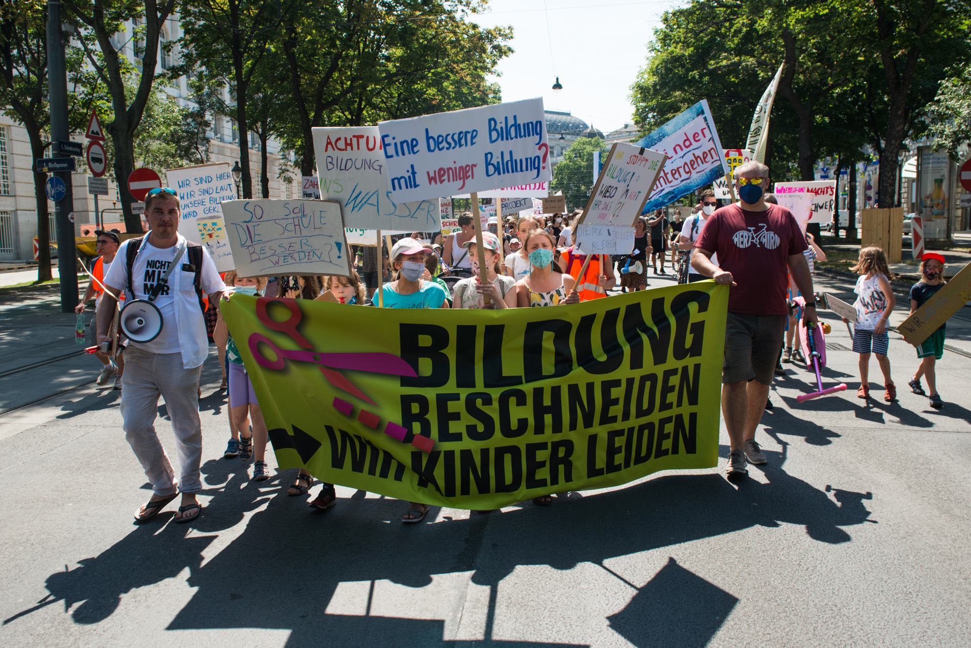Rund 2000 Kinder, Eltern und Lehrer*innen versammelten sich am Montag, den 28.6.2021 beim Rathaus, um gegen die neue Vergabe von Lehrer*innen-Stunden zu demonstrieren. Der Protest richtete sich gegen Stadtrat Wiederkehr und die Bildungsdirektion Wien, die unter den Schlagwörtern „Reform“ und „Transparenz“ ein großes Sparpaket umsetzen. Die neue Vergabe von Lehrer_innenstunden erfolgte so knapp, dass an Schulen nicht einmal die stundenplanmäßigen Unterrichtsstunden abgedeckt werden können. Förderstunden werden gestrichen, Projekte wie die Mehrstufenklassen drohen aufgelöst zu werden, Integrationsklassen* wird die Arbeit erschwert, künftig sollen bis zu 20 Kinder in einer Deutschförderklasse* sitzen. Weder der Bildungsdirektor Himmer noch der Stadtrat Wiederkehr wollten mit den jungen Demonstrant*innen sprechen. (Radio Orange, WiderstandsChronologie vom 3.7.2021)