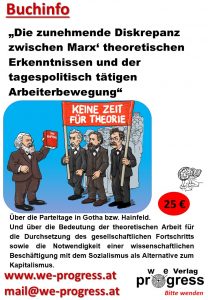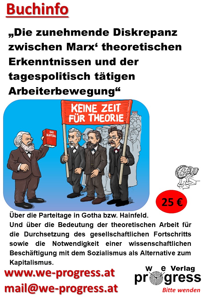 Das Buch: „Die zunehmende Diskrepanz zwischen Marx‘ theoretischen Erkenntnissen und der tagespolitisch tätigen Arbeiterbewegung“ ist Ende August 2021 im Verlag we-progress (Graz) erschienen. Inhaltsverzeichnis (pdf)