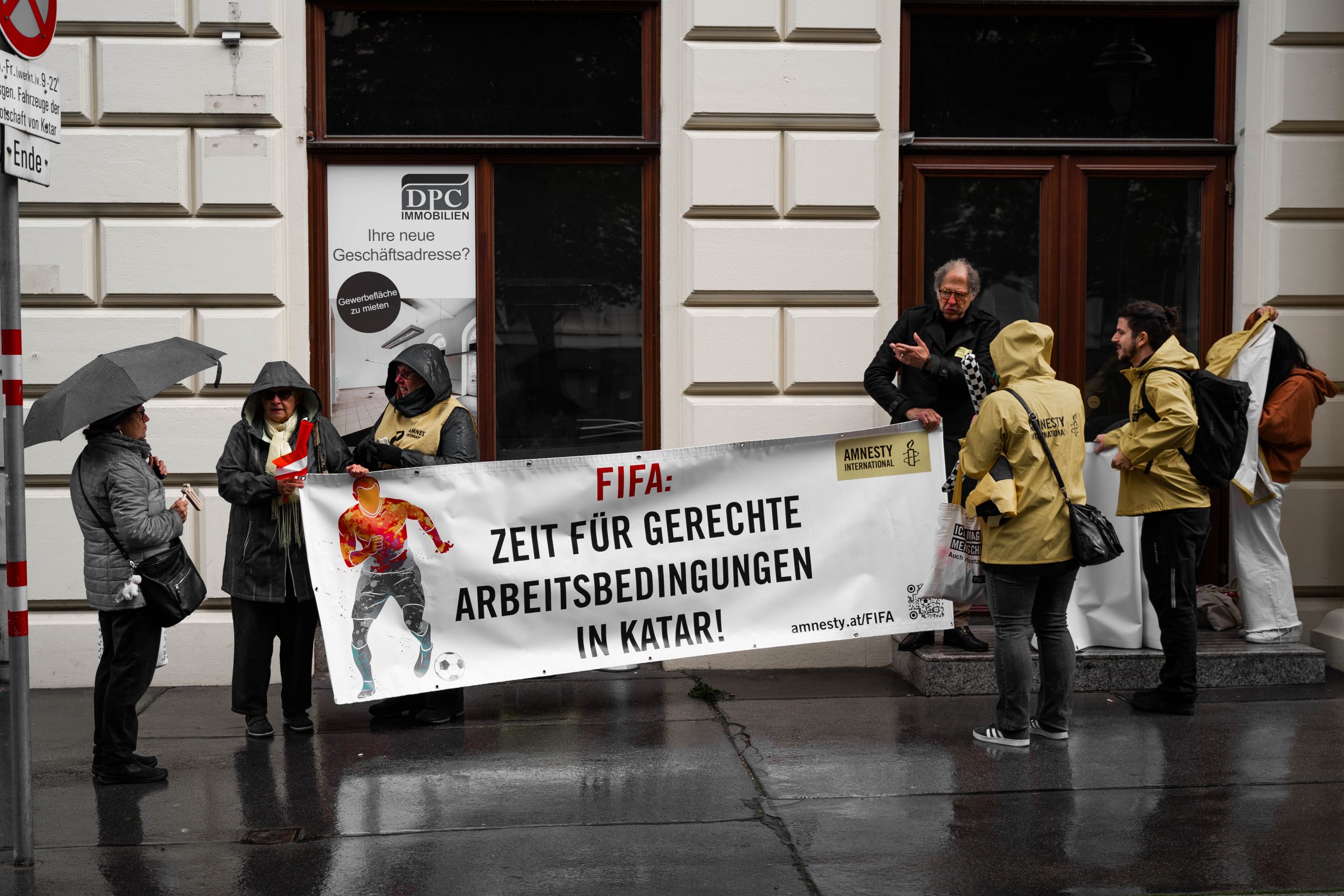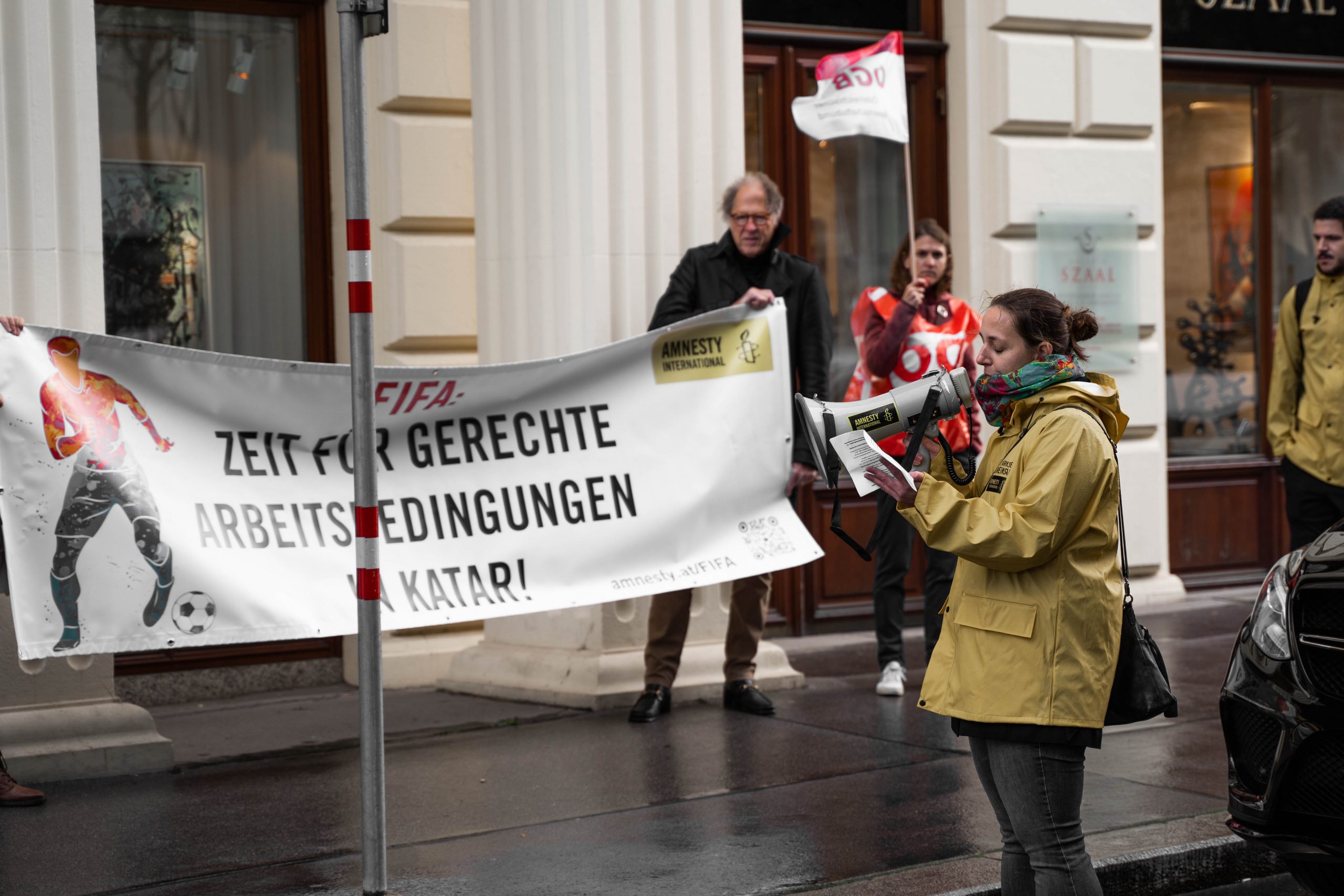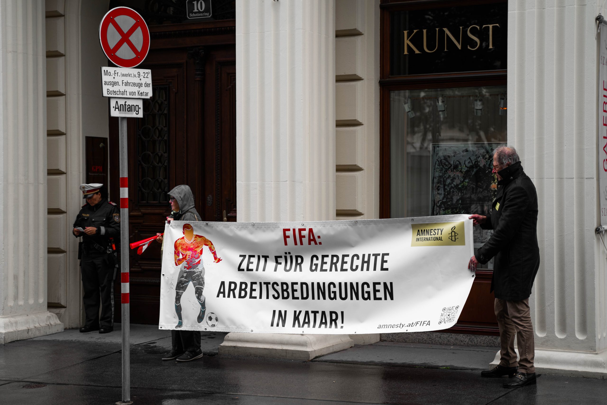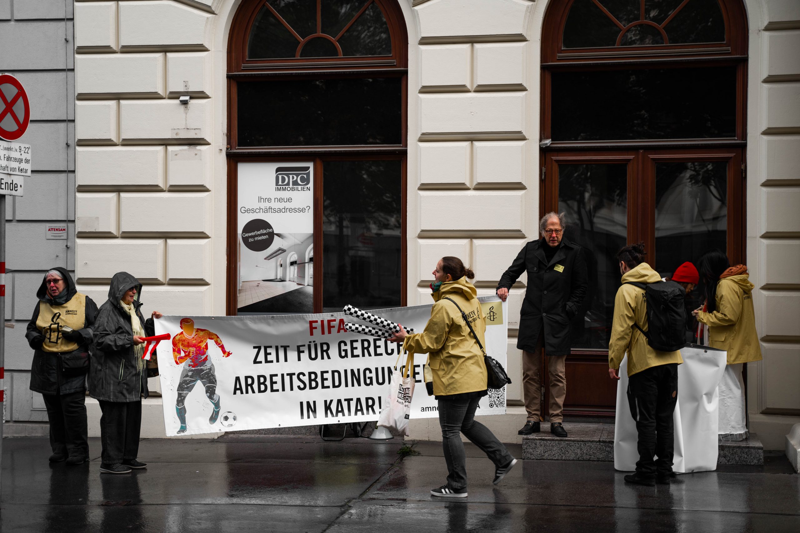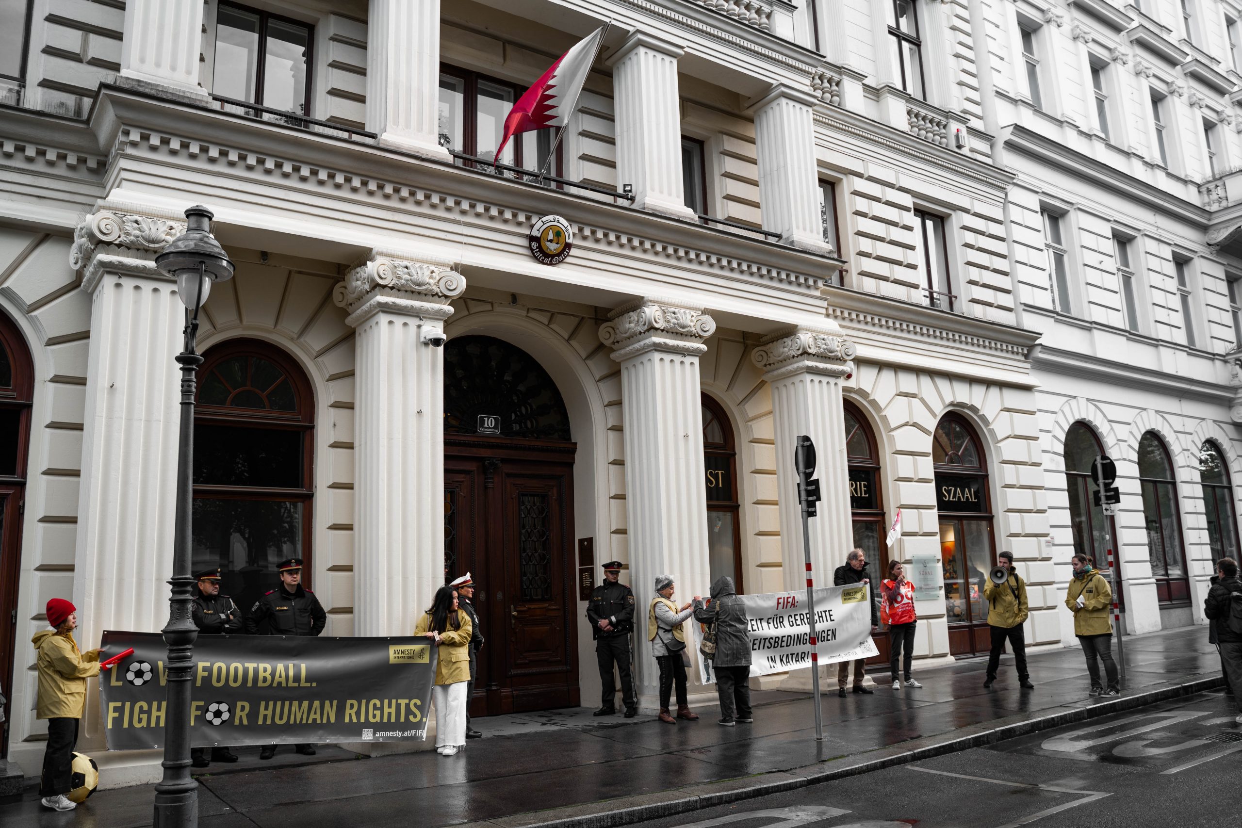 Die Diskussion im ÖGB-Catamaran war nicht die einzige Veranstaltung, die am Dienstag in Wien zu diesem Thema stattfand. Schon am Nachmittag versammelten sich Amnesty International und weltumspannend arbeiten vor der katarischen Botschaft in Wien und äußerten ihren Unmut über die Lage im Emirat.