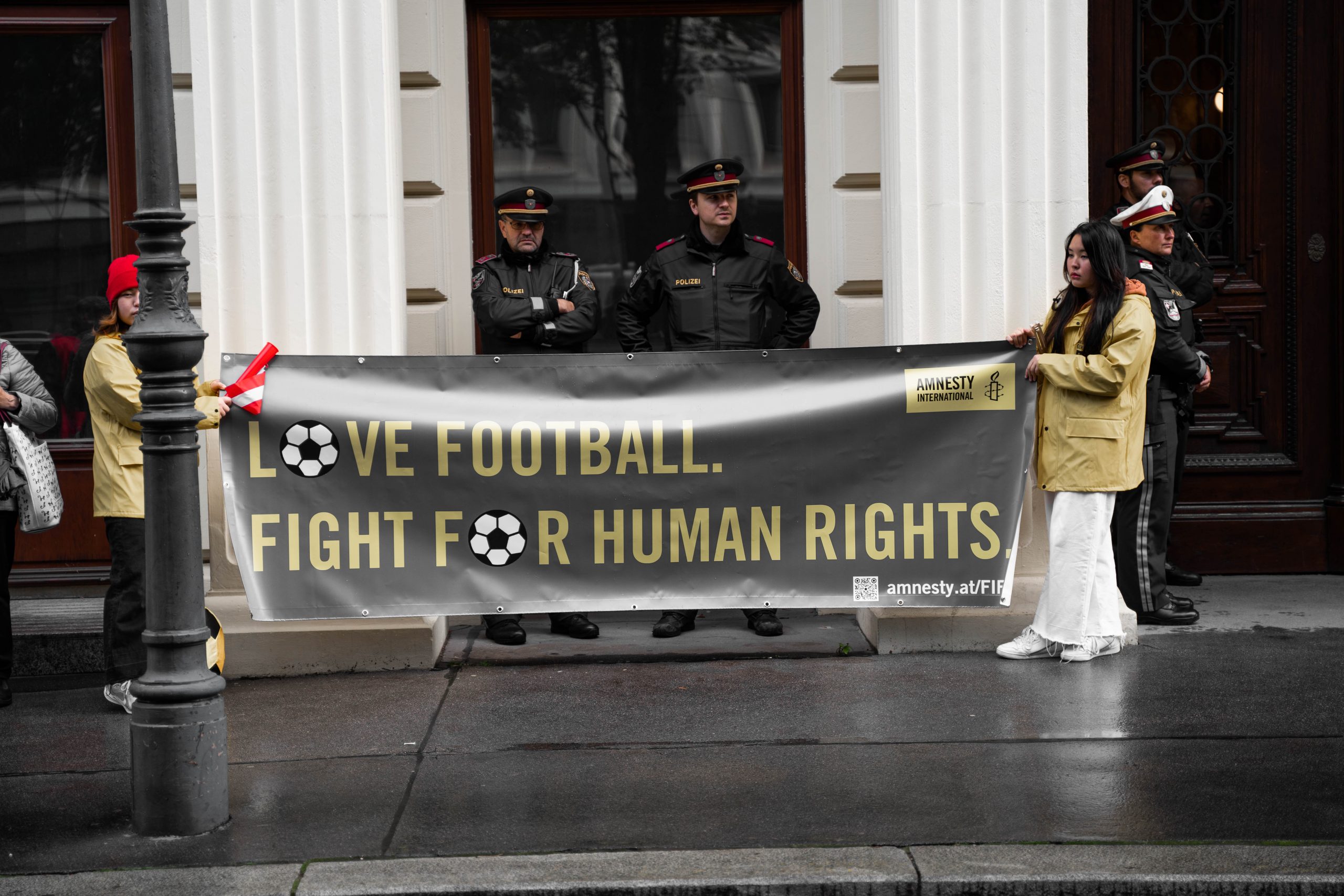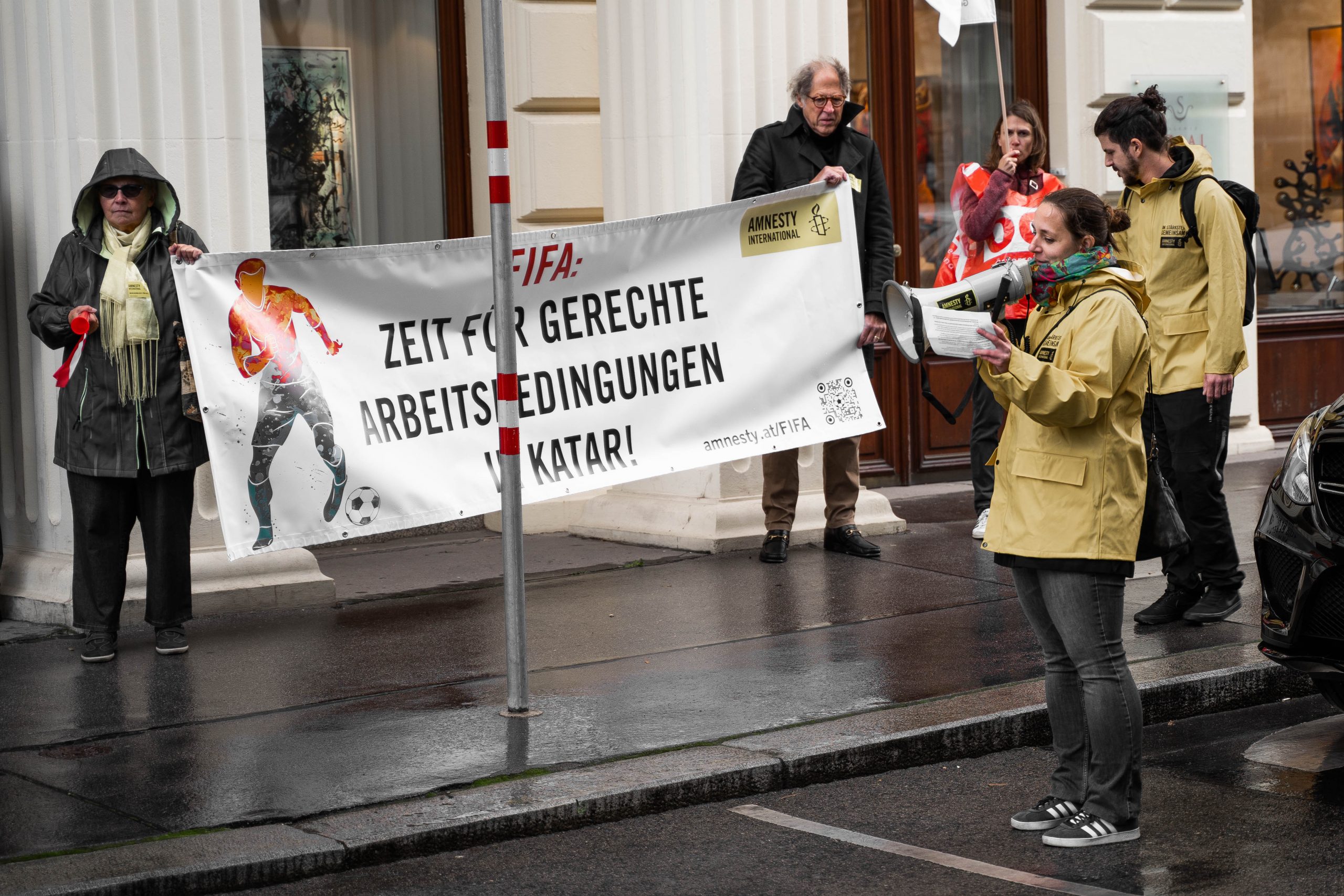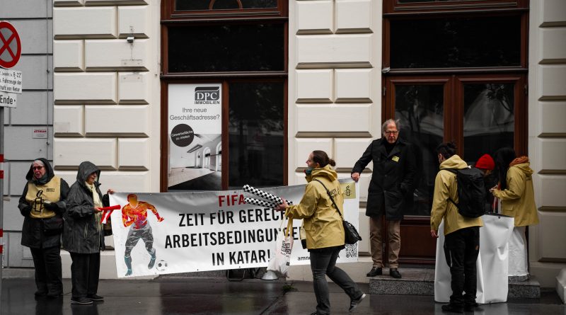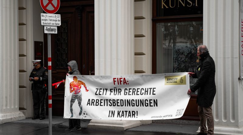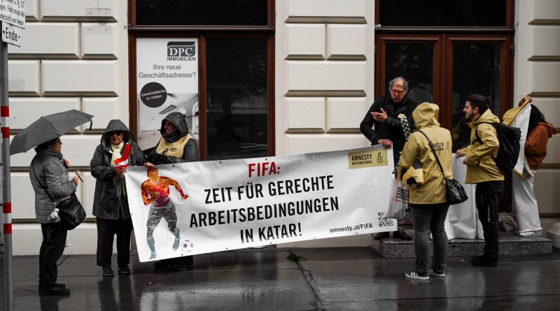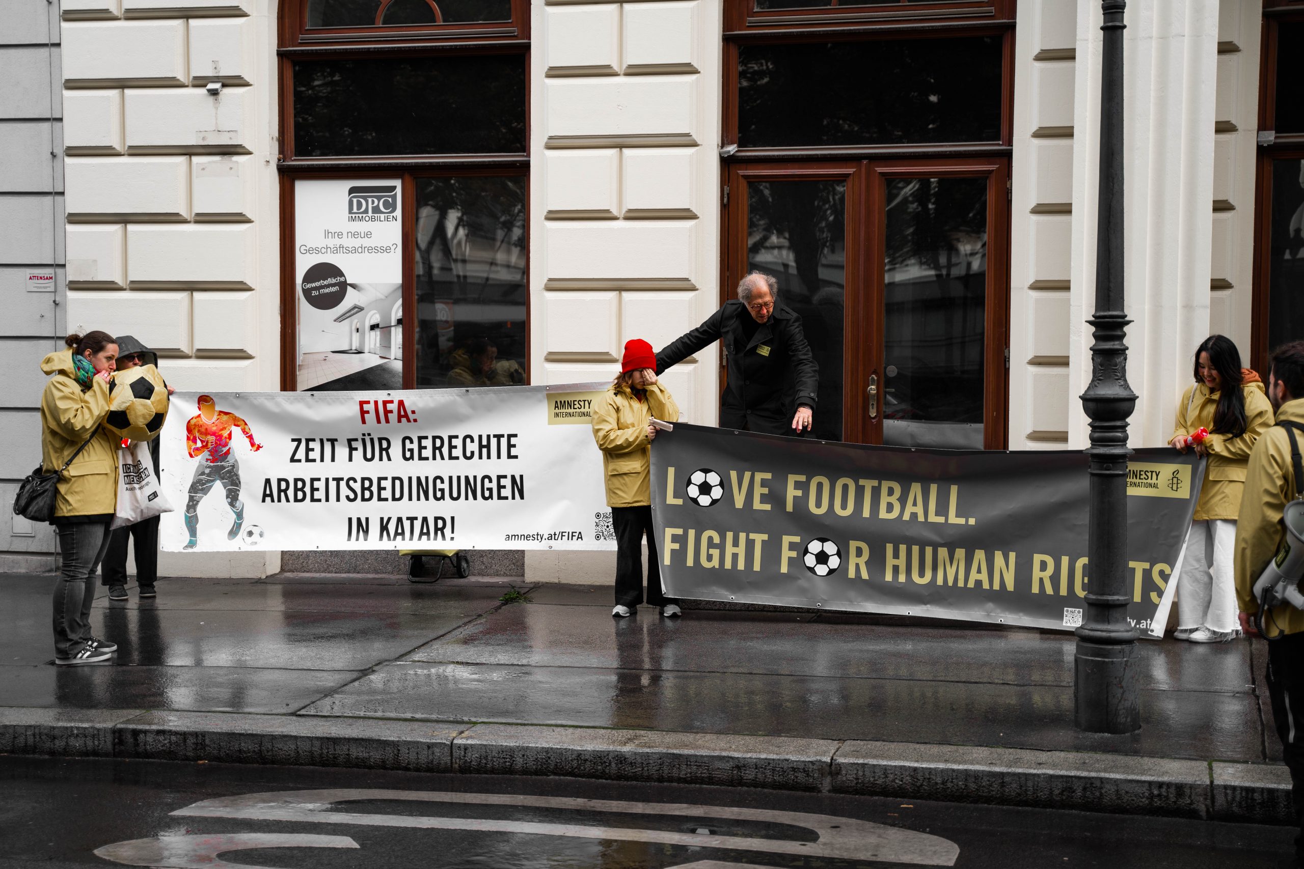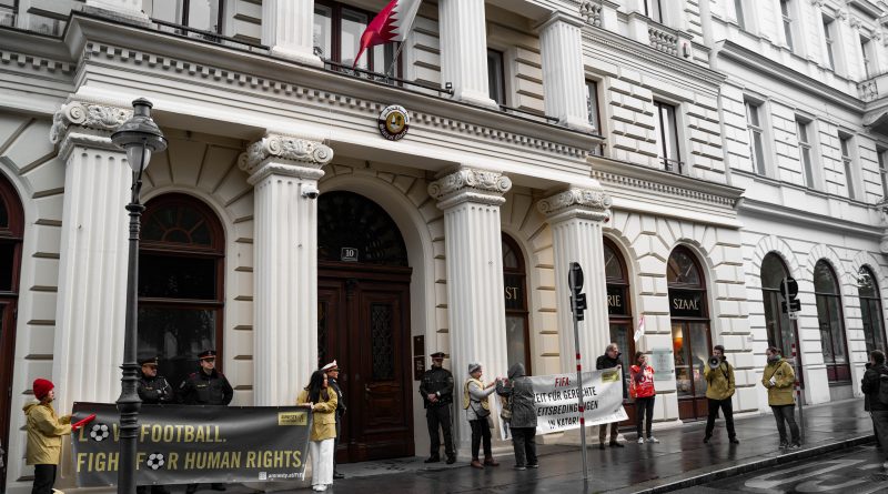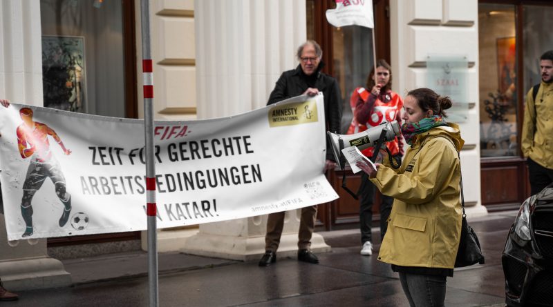Die Diskussion im ÖGB-Catamaran war nicht die einzige Veranstaltung, die am Dienstag in Wien zu diesem Thema stattfand. Schon am Nachmittag versammelten sich Amnesty International und weltumspannend arbeiten vor der katarischen Botschaft in Wien und äußerten ihren Unmut über die Lage im Emirat.