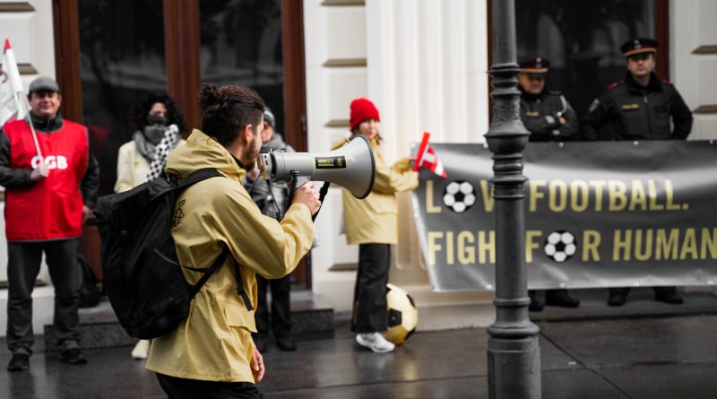 Lautstark forderten die Demonstrant*innen gerechte Arbeitsbedingungen in Katar und skandierten „Love Football. Fight for Human Rights“. Ein paar Eindrücke von der Kundgebung am Schottenring: