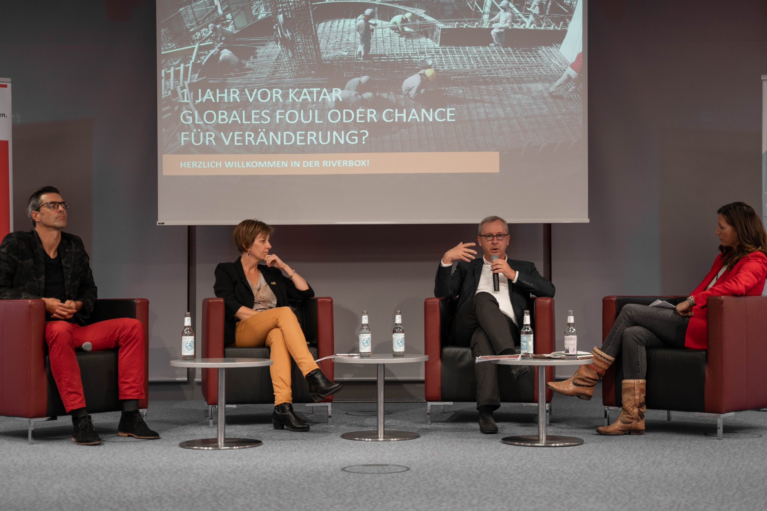 Teile dieser Kontrollaufgaben hätten die Gewerkschaften übernommen, erklärte Christian Fölzer: „Wir sind diejenigen, die schauen, dass es in Katar auf der Baustelle menschenwürdig zugeht.“ Auch er unterstrich die Diskrepanz zwischen Änderungen auf dem Papier und den tatsächlichen Arbeitsbedingungen vor Ort. Man sei zwar auf dem richtigen Weg, jedoch noch lange nicht am Ende.
