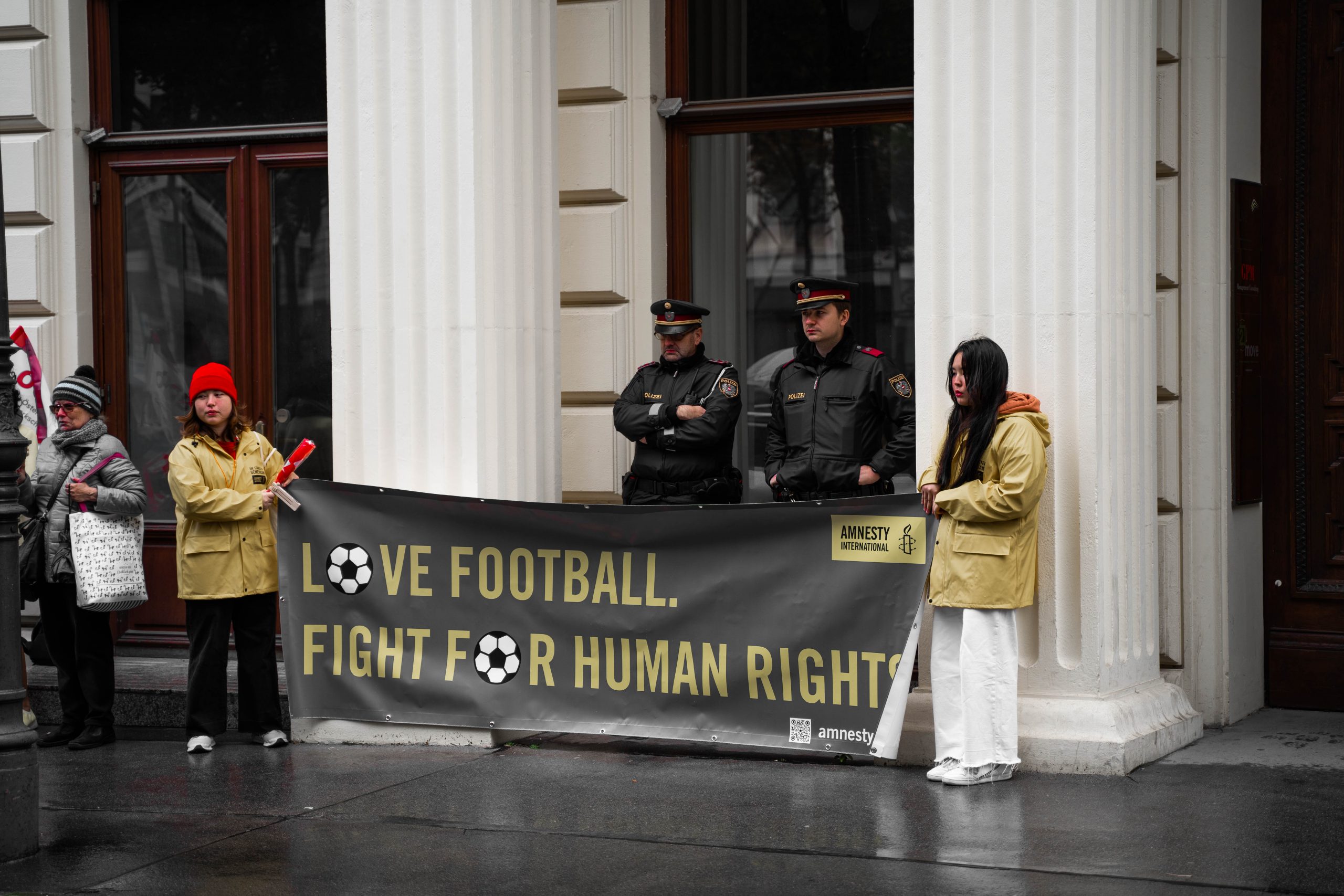 Titelbild: Aktivist*innen von Amnesty Österreich vor der katarischen Botschaft in Wien, Oktober 2021. Foto: Unsere Zeitung/Moritz Ettlinger