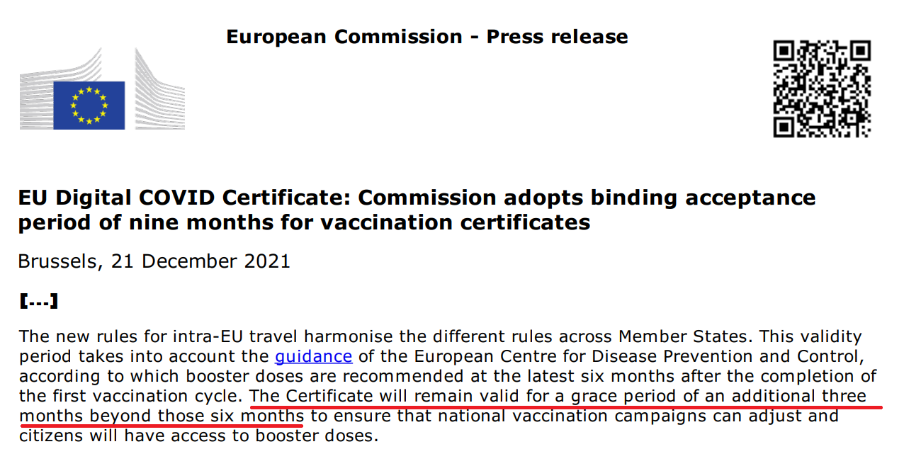 Wörtlich heißt es in einer Pressemitteilung der EU-Kommission vom 21. Dezember 2021 zum EU Digital COVID Certificate, welches in 60 Länder und Territorien auf fünf Kontinenten angewendet wird: „Auffrischungsdosen werden spätestens sechs Monate nach Abschluss des ersten Impfzyklus empfohlen. Das Zertifikat bleibt über diese sechs Monate hinaus für eine Nachfrist von weiteren drei Monaten gültig, um sicherzustellen, dass sich die nationalen Impfkampagnen anpassen können und die Bürger Zugang zu Auffrischungsdosen haben.“