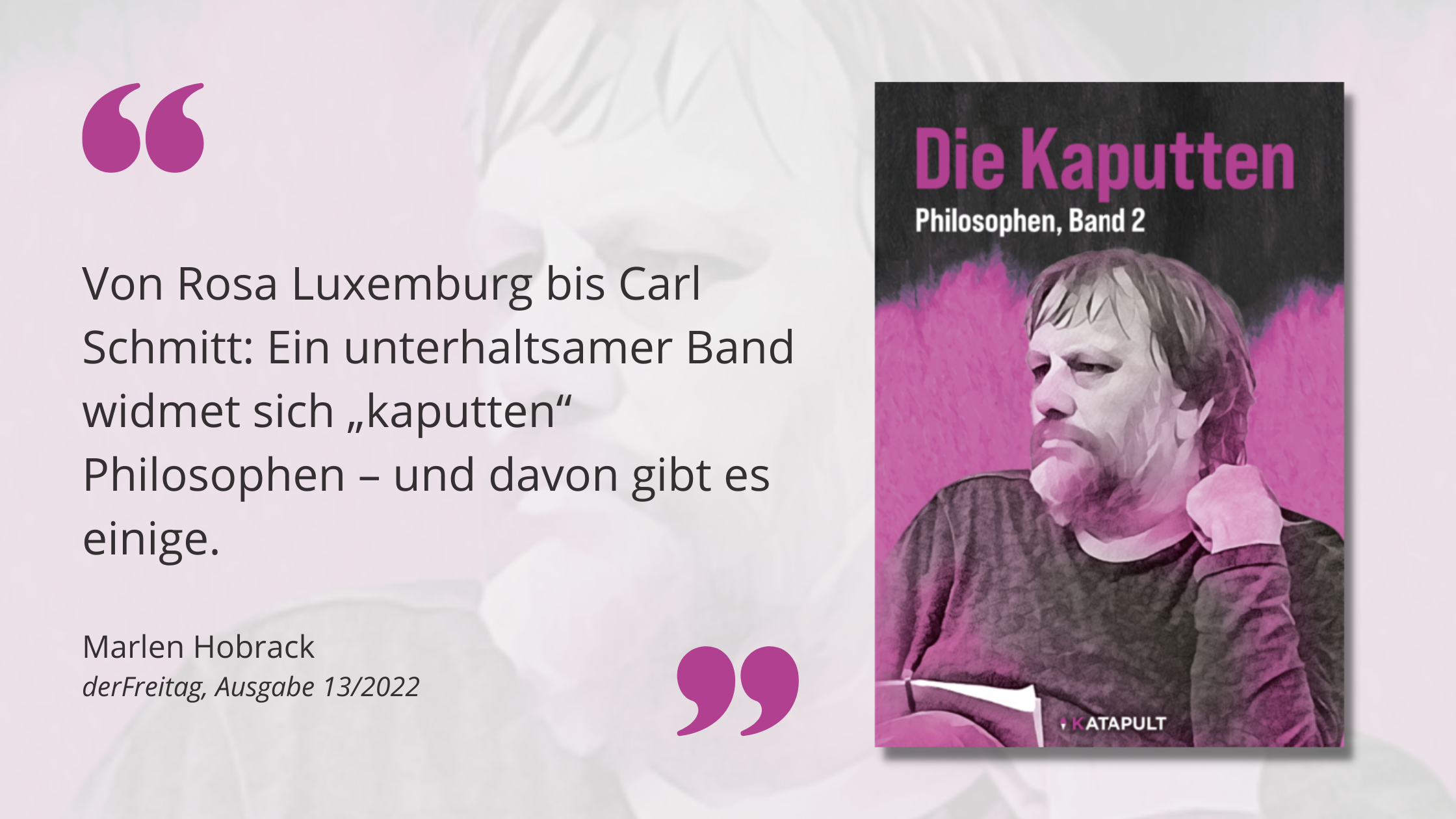 Ein alter Linker, der zum Vordenker der Neuen Rechten wird – nachdem ihn die Faschisten zu Tode gefoltert hatten. Eine Anarchistin, die in den Krieg zieht und im Kochtopf landet – bevor sie Gott begegnet und aufhört zu essen. Ein unkonventioneller Marxist, dem Tausende zuhören wollen, der 99 Prozent der Menschheit aber für langweilige Idioten hält. Sie alle haben ihren Auftritt in ≫Die Kaputten und die Kaputtgemachten (der Philosophie)≫.