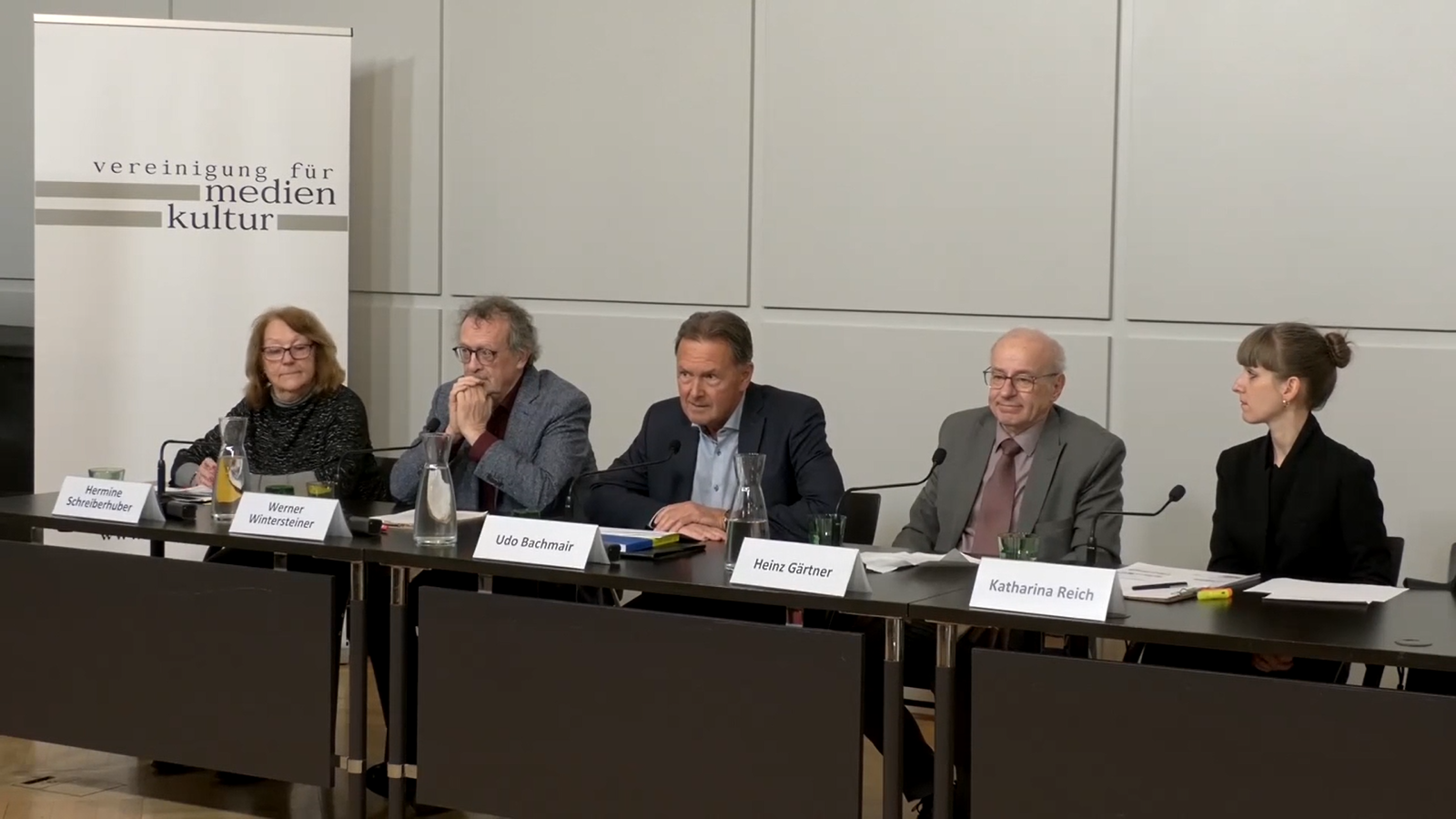 Moderiert von Udo Bachmair (Journalist, Präsident der Vereinigung für Medienkultur) stellten sich der Politikwissenschafter Heinz Gärtner, die Publizistin Katharina Reich, die langjährige APA-Journalistin Hermine Schreiberhuber, der Friedensforscher Werner Wintersteiner und ORF-Korrespondent Christian Wehrschütz folgenden Fragen: