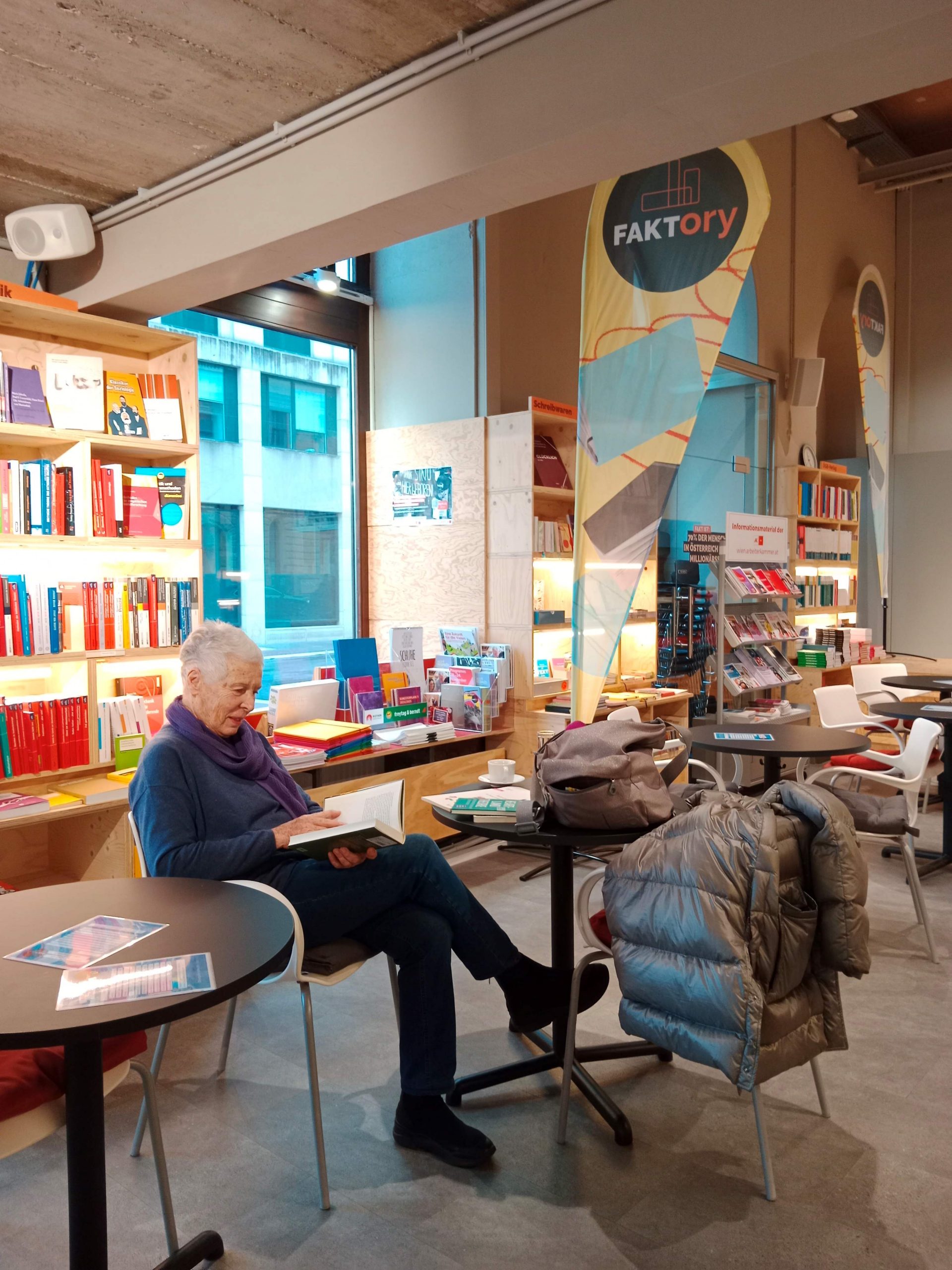 Immer schon habe ich mich gerne in Buchhandlungen aufgehalten, in den letzten Jahren wird das aber fast zu einer Manie, allerdings zunehmend gedämpft durch schlechtes Steh- und Sehvermögen. Umso wichtiger ist daher die Atmosphäre, die zu einem längeren, schmerzlosen Aufenthalt einlädt. Diese Atmosphäre habe ich in der Buchhandlung ‚FAKTory‘ der AK-Wien und des ÖGB-Verlags gefunden.