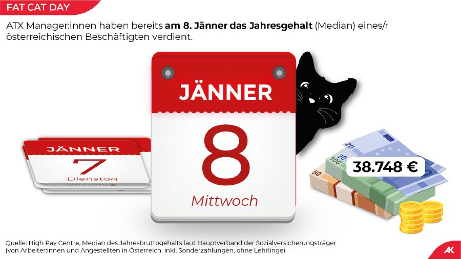 Der „Fat Cat Day“ ist ein Paradebeispiel dafür, wie ungerecht die Einkommen verteilt sind. Die „Fat Cats“ verfügen mit einem durchschnittlichen Stundenlohn von 814 Euro bereits am 8. Jänner über das Jahreseinkommen einer/eines durchschnittlichen österreichischen Beschäftigten, dessen Jahres-Medianeinkommen bei 38.748 Euro liegt. “Beschäftigte müssten ihr Arbeitsleben verdoppeln und 81 Jahre lang arbeiten, um in ihrem gesamten Leben ein Jahresgehalt eines Vorstands zu beziehen”, verdeutlicht der Österreichische Gewerkschaftsbund (ÖGB) plakativ diese Ungerechtigkeit.