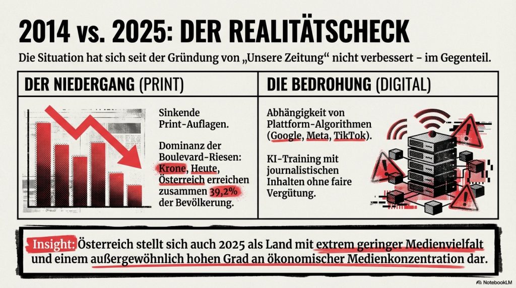 UZ-Vorsitzender Michael Wögerer bedankte sich bei allen, die seit der Gründung von Unsere Zeitung (2014) das Projekt unterstützt haben und betonte in seiner Präsentation, dass die kommenden Jahre entscheidend sein werden, um eine sichtbare Alternative zum medialen Einheitsbrei zu schaffen.